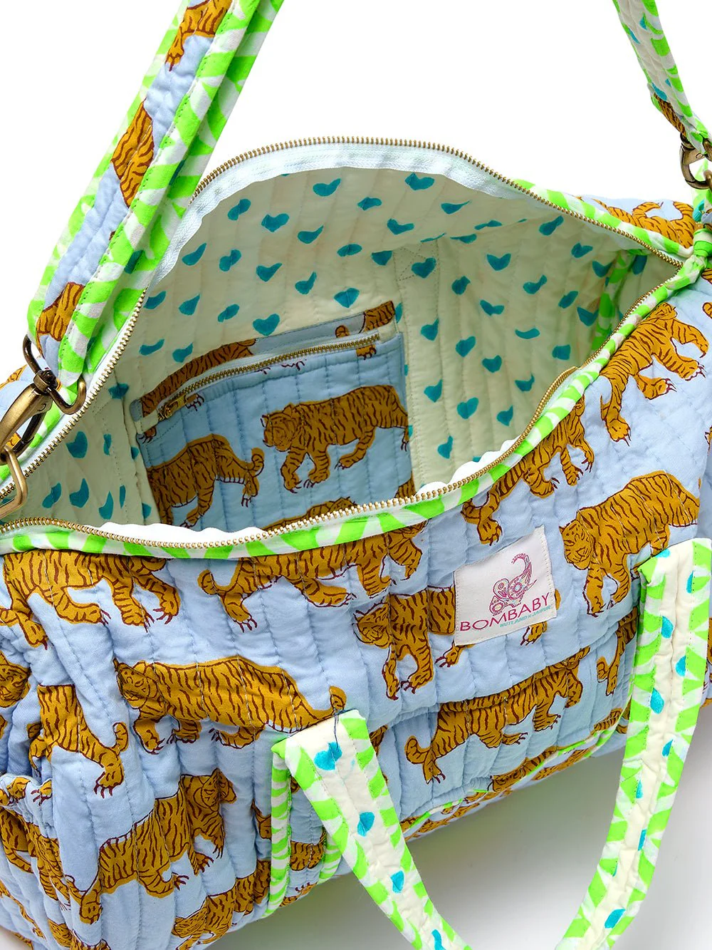 Embrace your wild side with the powder blue tiger: a weekend bag that’s effortlessly chic and full of untamed charm. Swathed in our exclusive powder blue tiger print and lined with a playful neon pink heart design, this bag captures the whimsical spirit of the Indian tiger with a bohemian edge. Neon piping adds a flash of colour, making this bag a true standout piece for free spirits with a taste for the exotic.