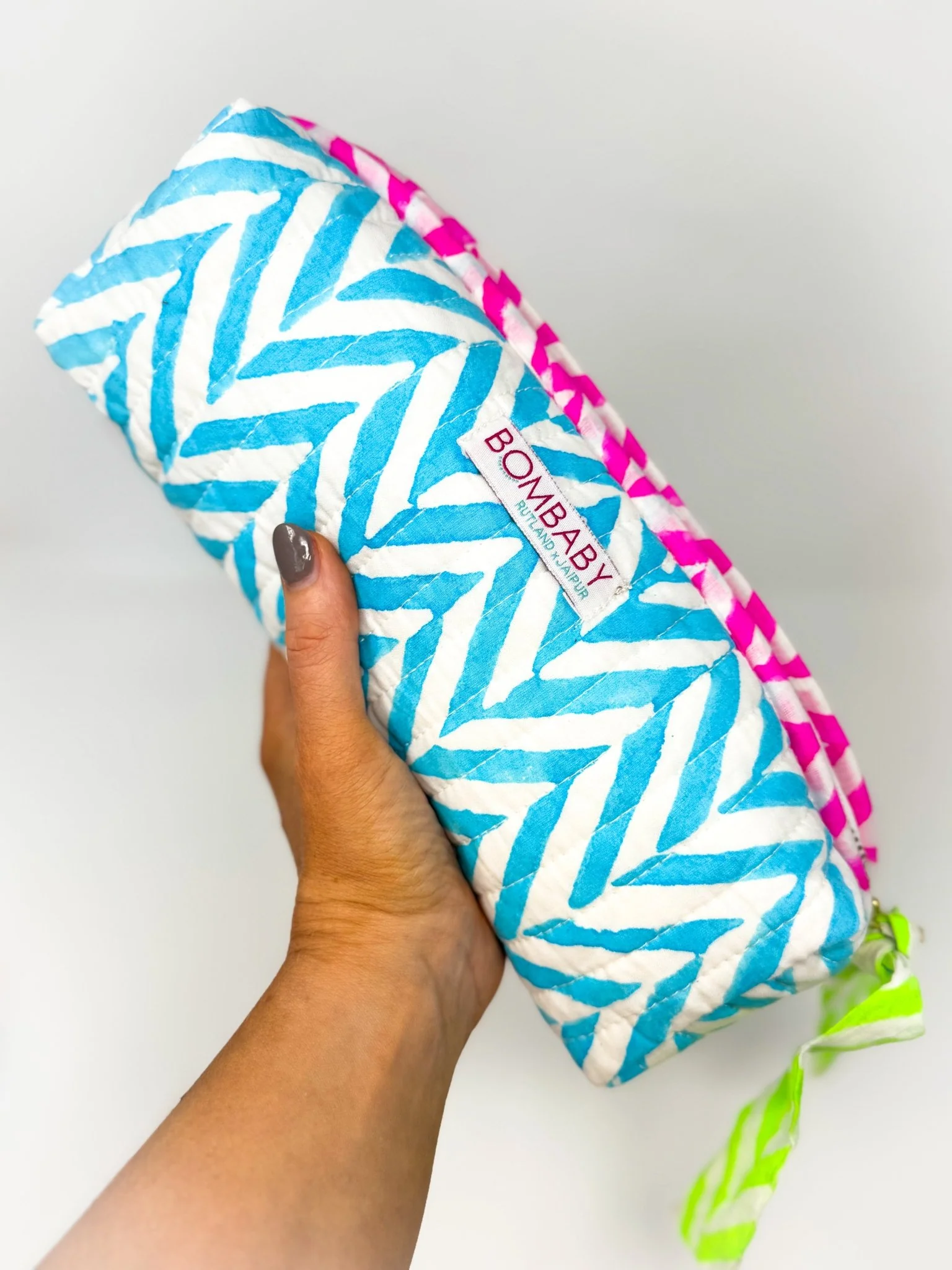 The Malibu Blue Chevron small case pairs crisp blue zig-zags with a flash of neon for that unmistakable Bombaby edge. Thickly quilted and beautifully structured, it’s compact on the outside yet deceptively roomy within.
