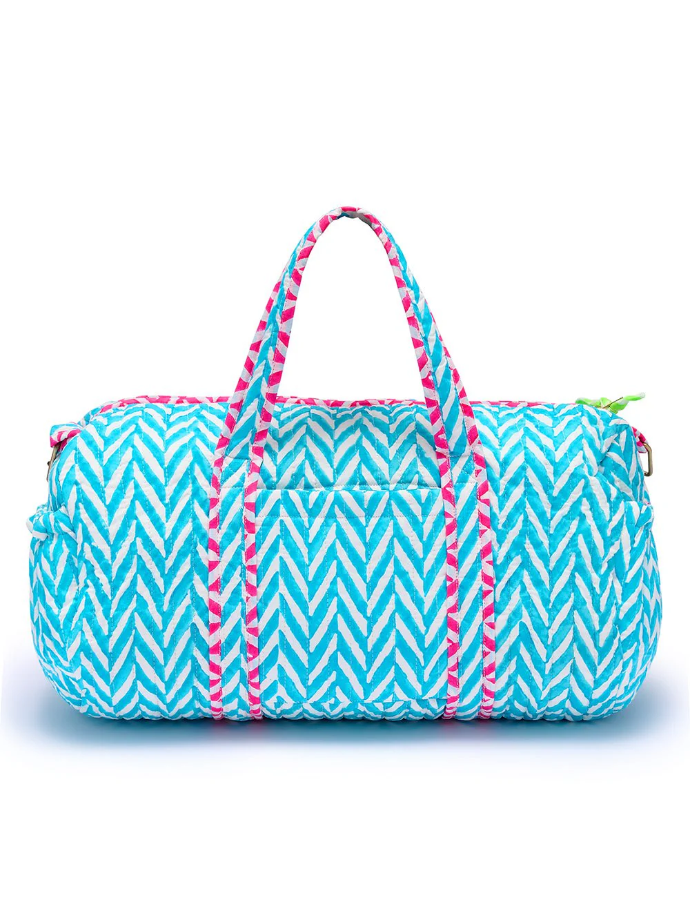 The Malibu Blue Chevron quilted weekend bag is pure, joyful style. Signature chevron stripes in our favourite shade of blue are finished with neon pink piping, a playful neon heart-print lining, and a statement bow. Timeless, fun, and effortlessly cool, it’s a bag that never goes out of style.