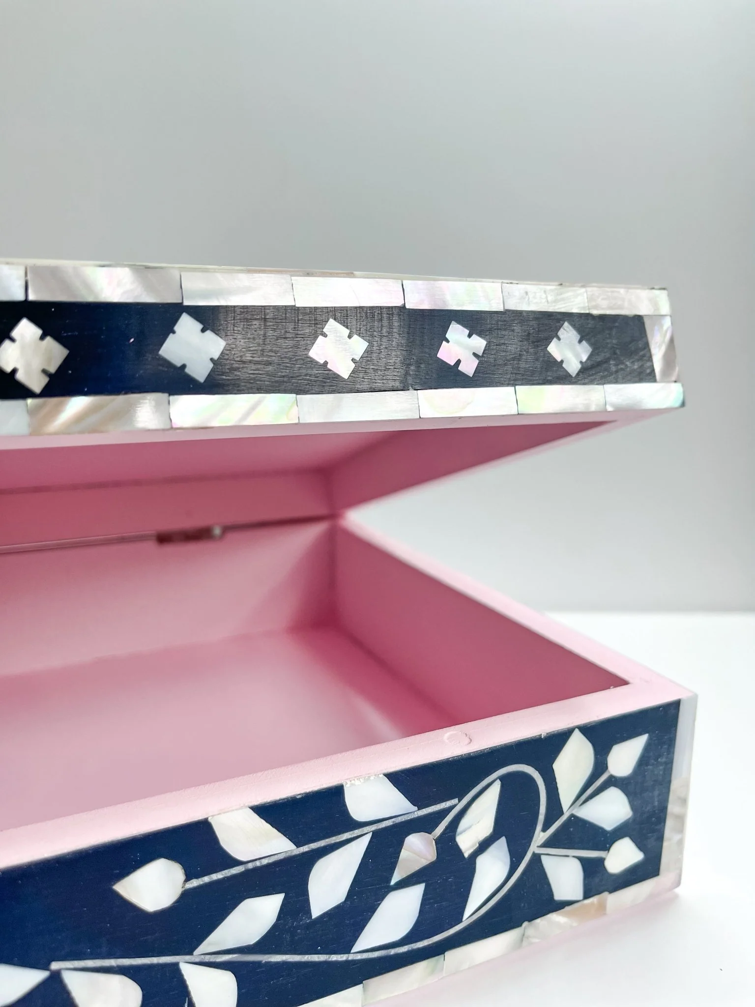 Classic and sophisticated, theĀ Twilight Luxe Mother of Pearl Treasure Box is designed for those who treasure timeless elegance. This strikingly deep, navy box shimmers in the light, with mother of pearl shells reflecting a quiet brilliance from every angle. Whether used to store heirloom jewellery, treasured photographs, or personal mementos, this generously sized box is where memories are kept safe, forever.