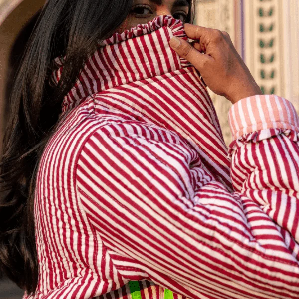 The merlot quilted jacket is our most romantic interpretation of sports-luxe to date. Cut from weighty GOTS-certified organic cotton twill, it balances softness with structure, colour with confidence. Deep merlot pinstripes ground the piece, while customised side racing stripes add a sharp, high-end edge.