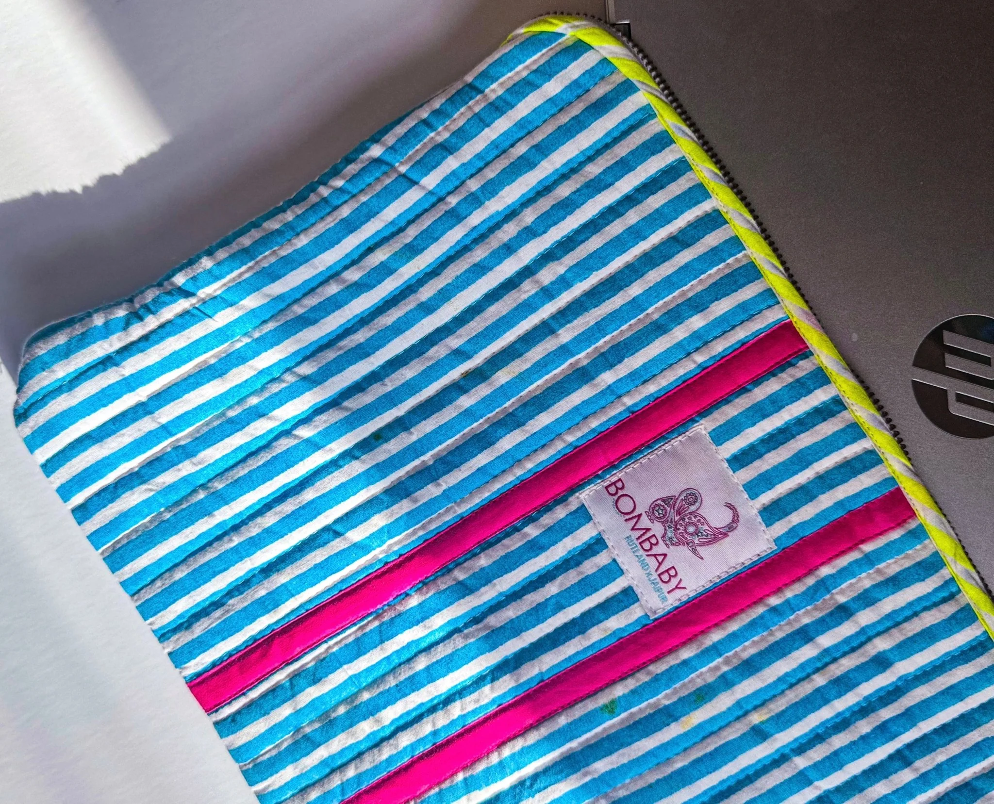 The Malibu Pop Customised Quilted Pouch layers soft blue pinstripes with hand-appliquƩd neon racing stripes, each one individually hand-finished for that unmistakable Bombaby punch