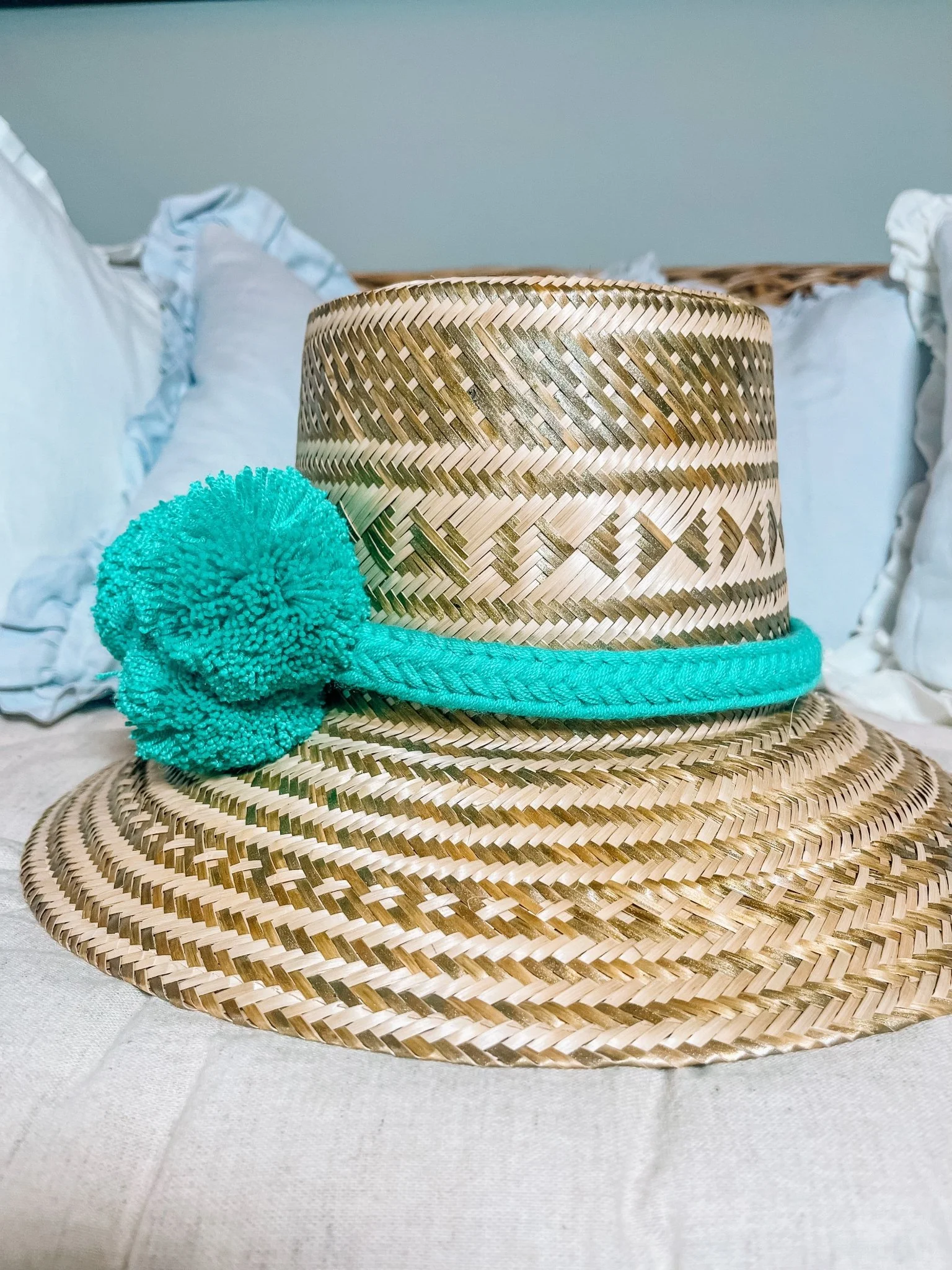 Beige woven hat with a turquoise pom pom band