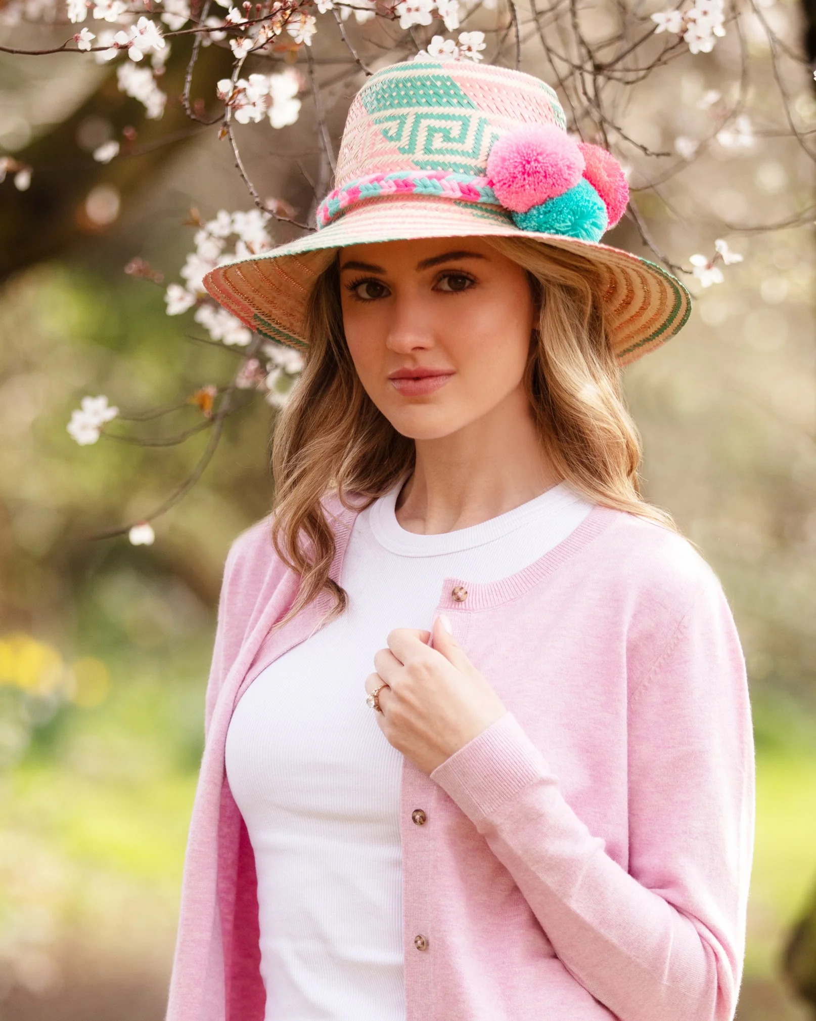 The life of the party - and proud of it. With its bold two-tone weave and a carnival-inspired pom pom band in pink, white and turquoise, The Cartagena is pure joy in hat form. Handmade by the Wayuu tribe, this piece celebrates craft, colour, and Colombian soul. And yes, itās also available in a Mini, because little sun-chasers deserve style too.