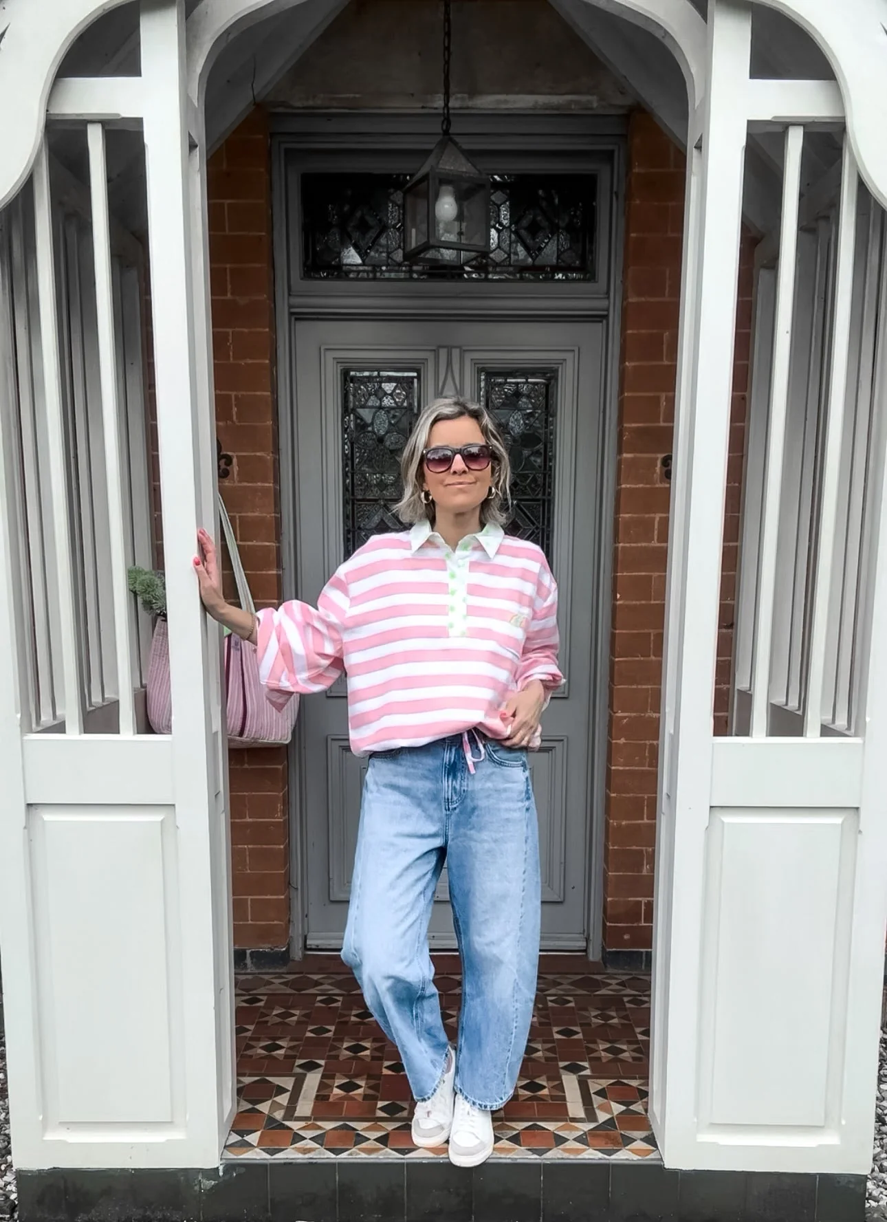 This rugby āblouseā filters sportswear through a more romantic lens. Pale rose stripes soften the silhouette, while the cut remains sharp and confident. Balloon sleeves add drama. The drawstring waist lets you decide how itās worn.